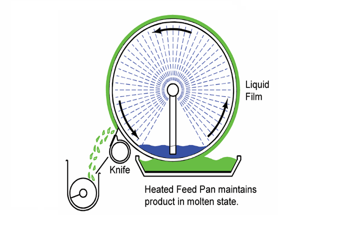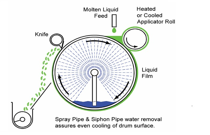É constituído por um tambor rotativo com um líquido de refrigeração pulverizado no interior e um método específico para aplicar o produto fundido à superfície do tambor. Os métodos de aplicação padrão são: uma bandeja de alimentação por imersão que é geralmente usada para produtos de baixa viscosidade, um rolo de aplicação que é geralmente usado para produtos sensíveis ao calor ou um rolo de agitação que é geralmente usado para produtos de super-resfriamento. O produto solidificado é removido 100% da superfície do tambor por um conjunto de barras de lâminas recartilhadas.